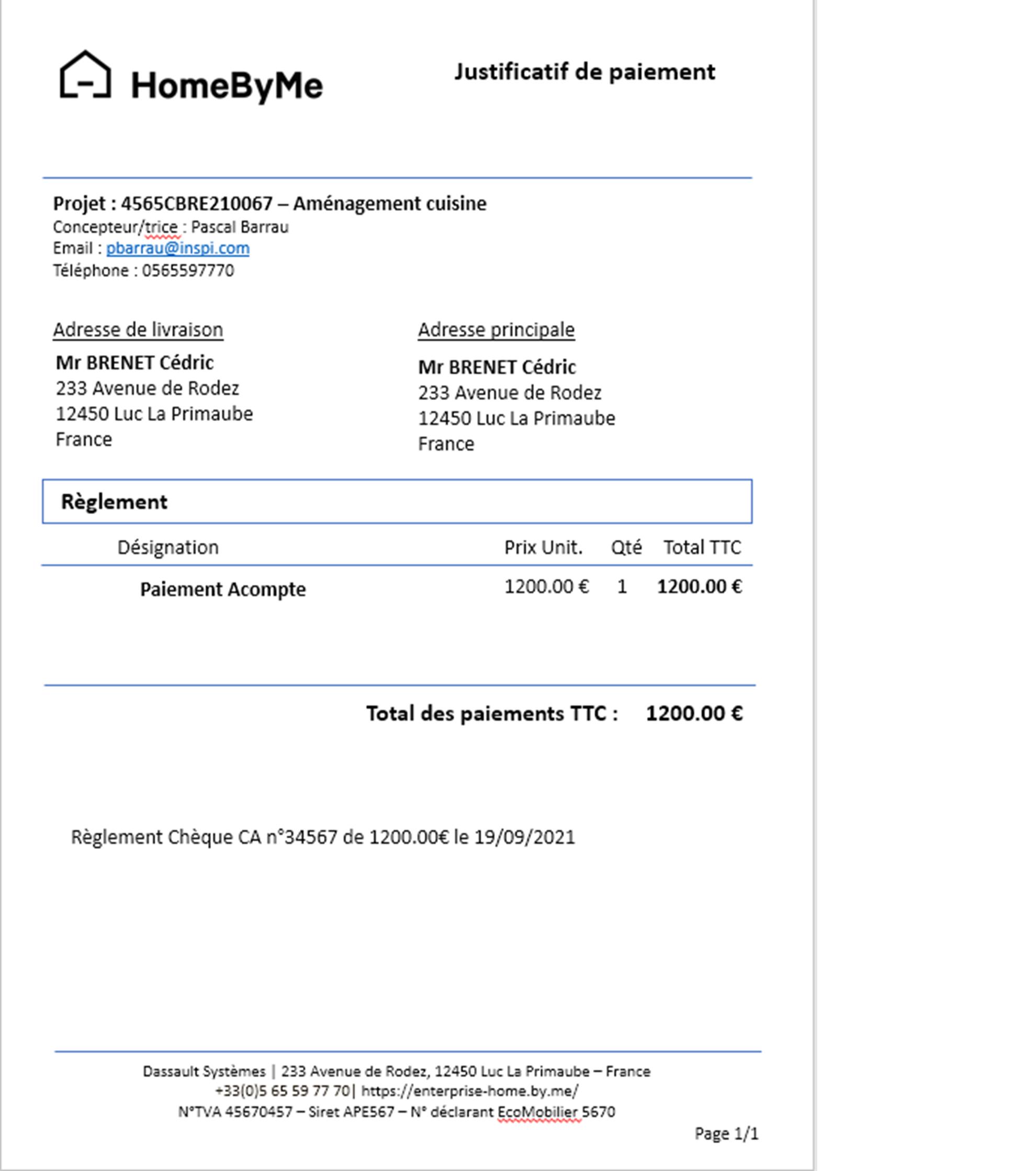 The proof of payment includes the payment information indicated as "paid" at the document level. It is available on the quote and the customer purchase order.