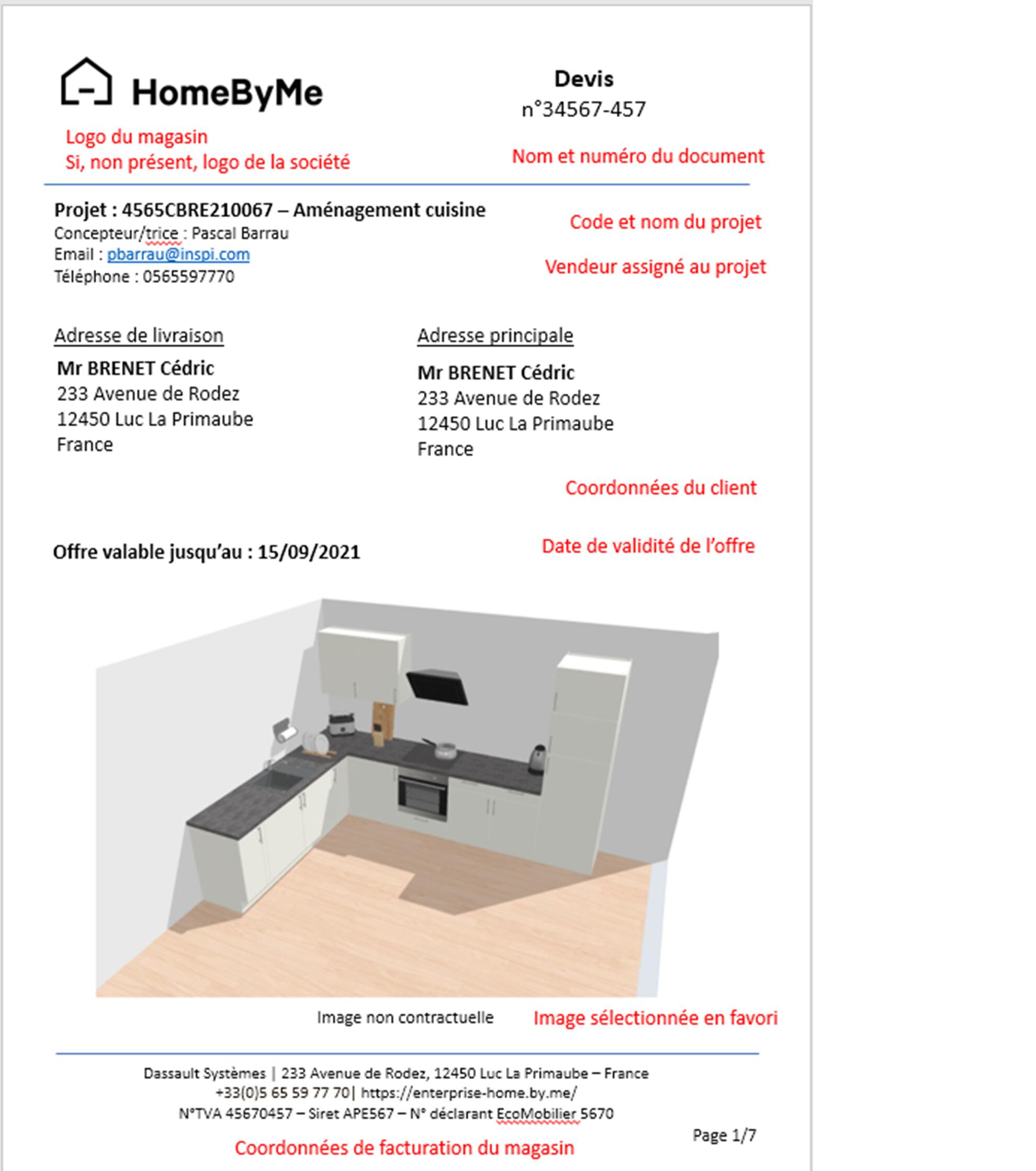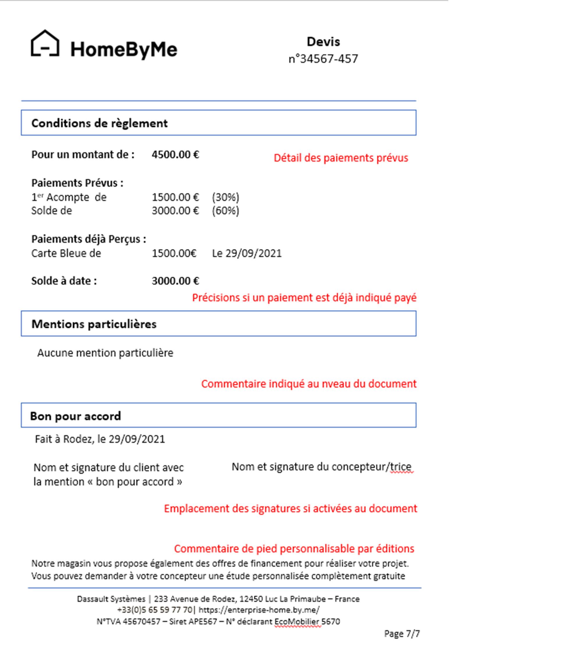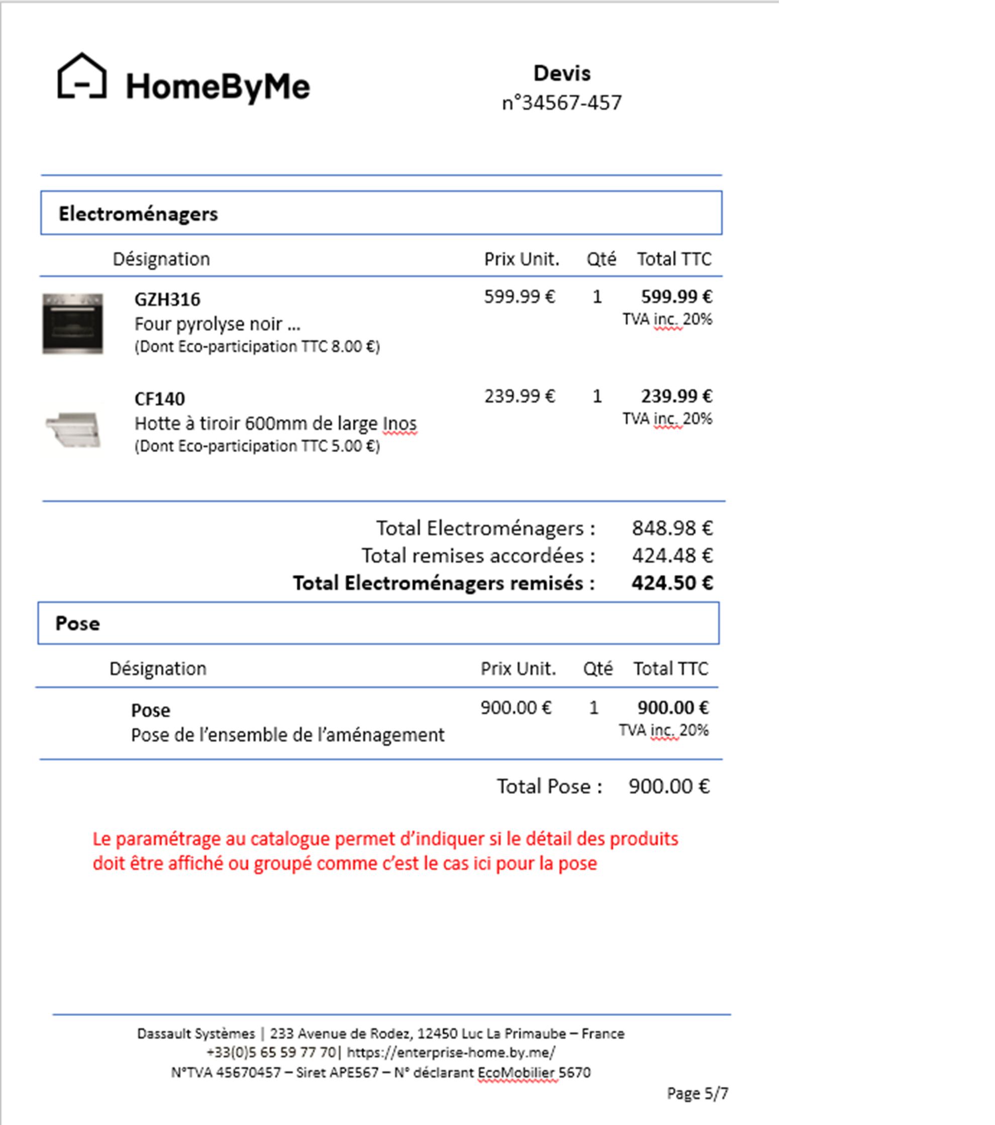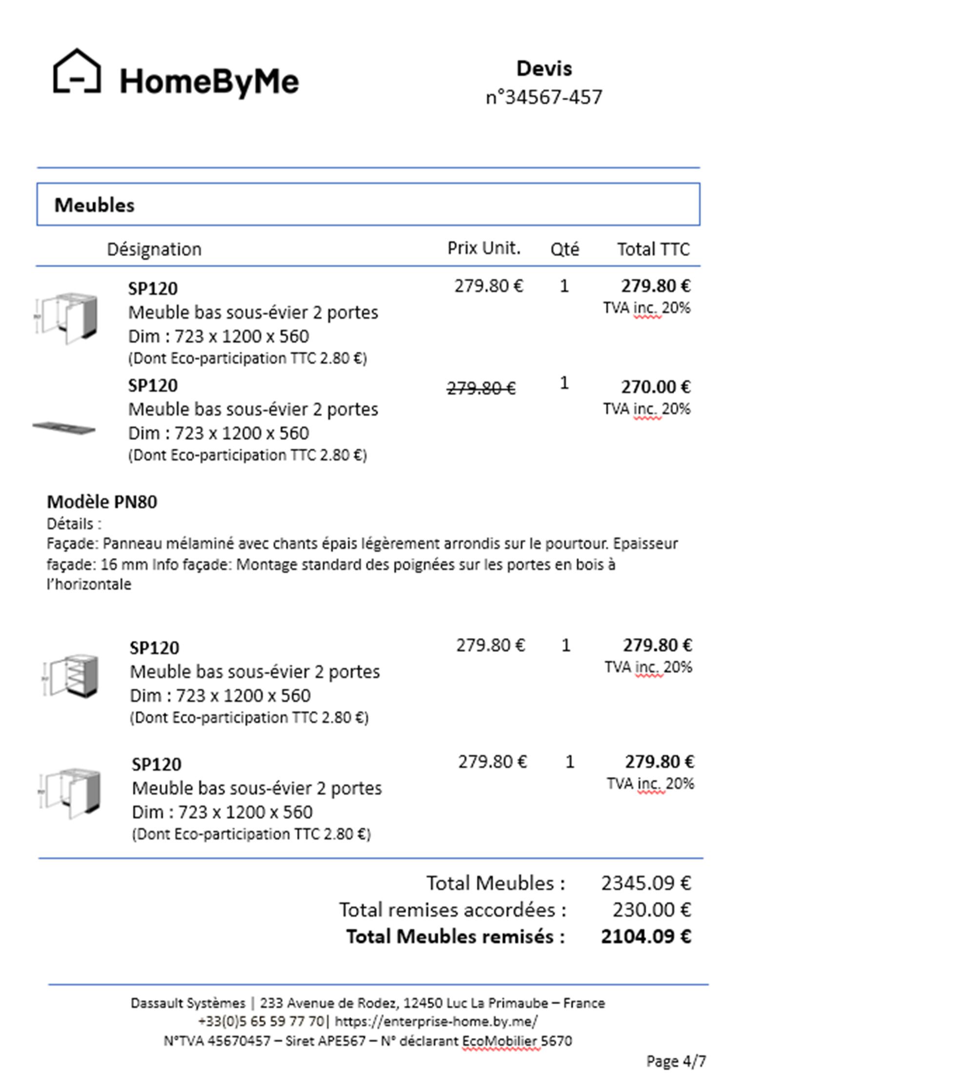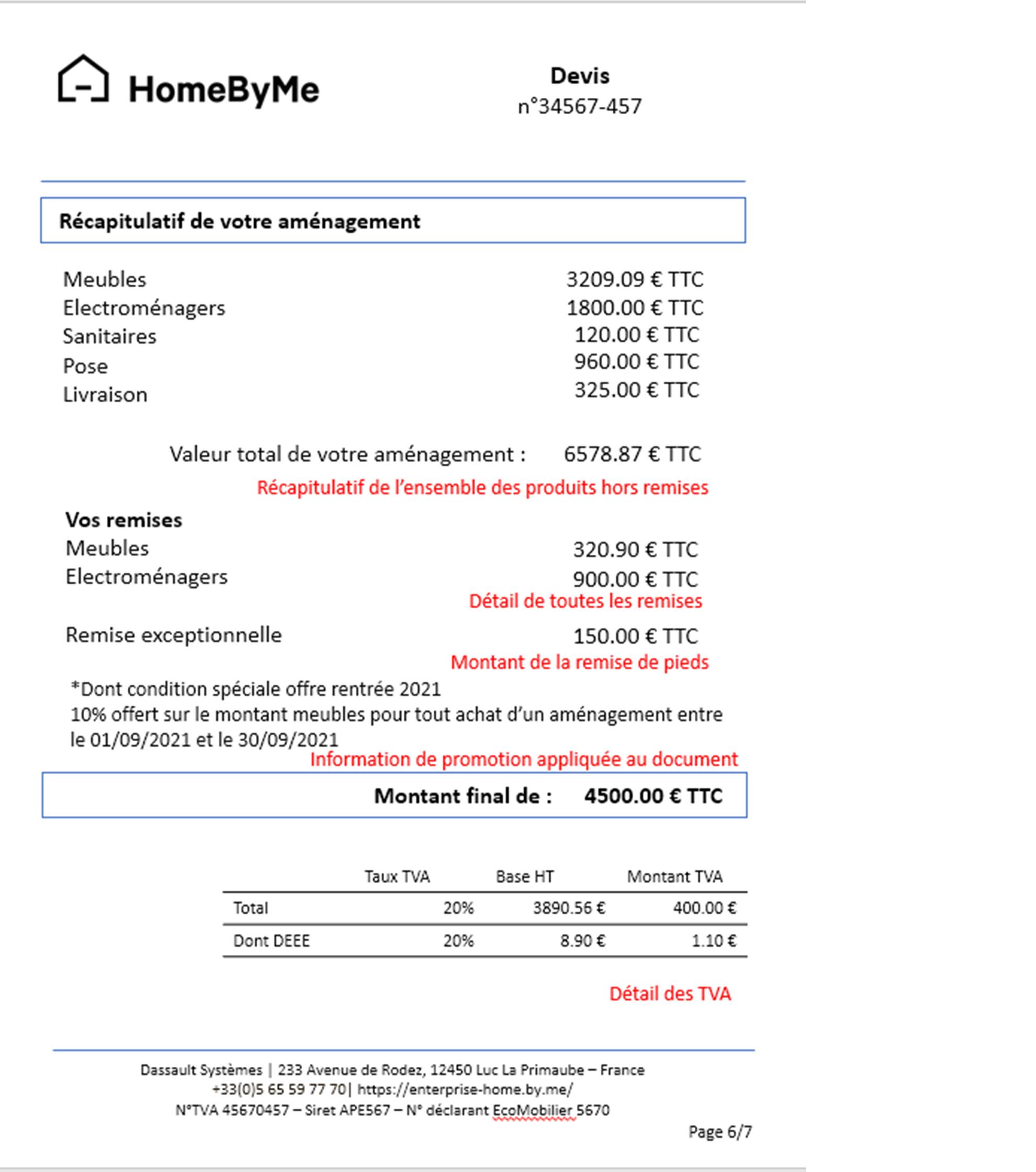 The customer quote is presented in the following format. The reduced VAT certificate is automatically added when the document contains products with reduced VAT. The general terms and conditions of sale are automatically added at the end of the document.