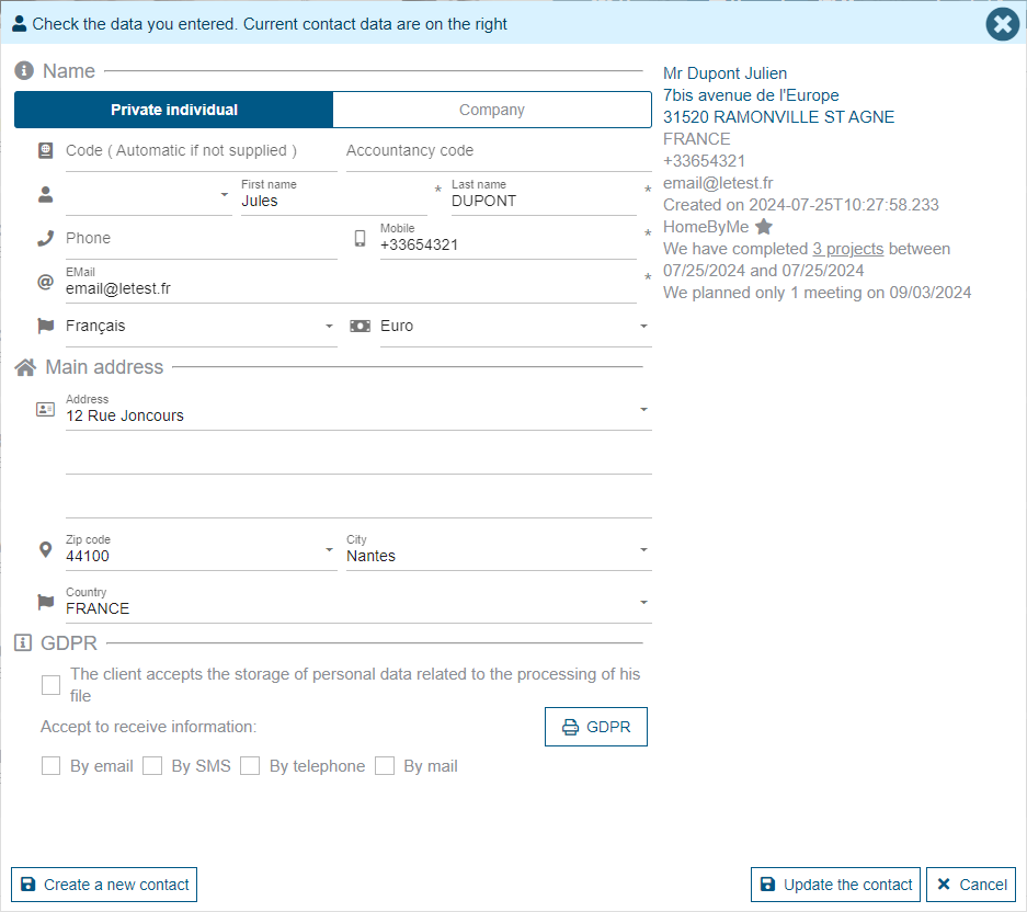 Once the customer is entered, a check is performed to verify whether this customer is already known by the user's company. If a match is found, Retail operations informs the user of this match, he can then update the information of the customer found or decide to create a new customer anyway. Updating customer information does not impact the documents that could be attached to the old entry but only updates the general information of the customer.