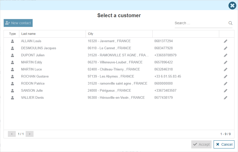 If the contact does not exist yet in your system, you can select the "New customer" action. This launches the creation of a new customer record (cf.Customer).