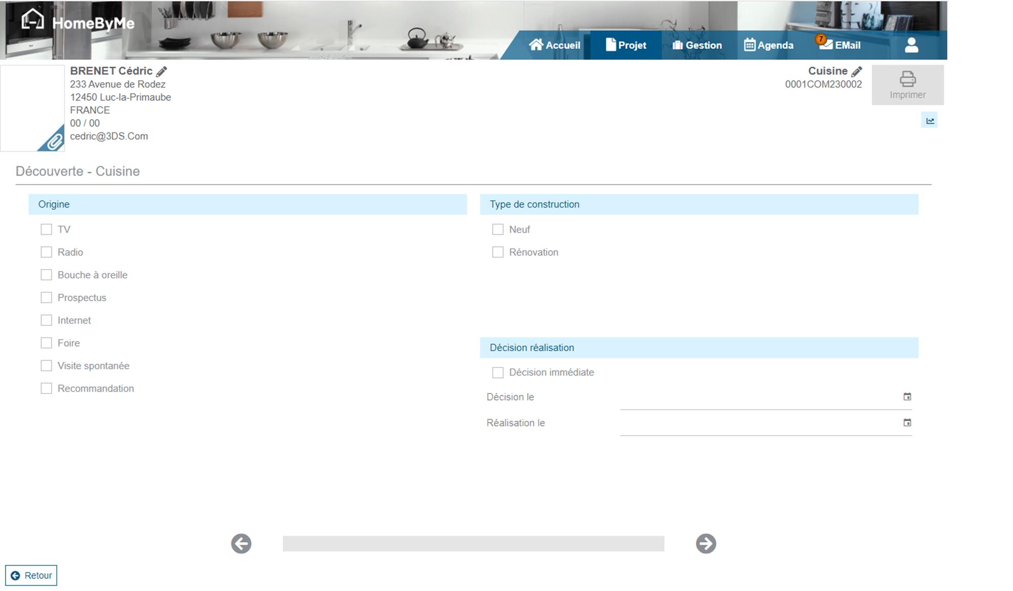 On estimate, it is possible to customize the number and content of the discoveries. The maximum number of possible discoveries is four. The discovery of a kitchen project like a closet project begins with general questions about the origin of the client, the type of home and the deadlines of the project. Next, questions on the form of the layout, the style, the materials and the desired services are proposed: