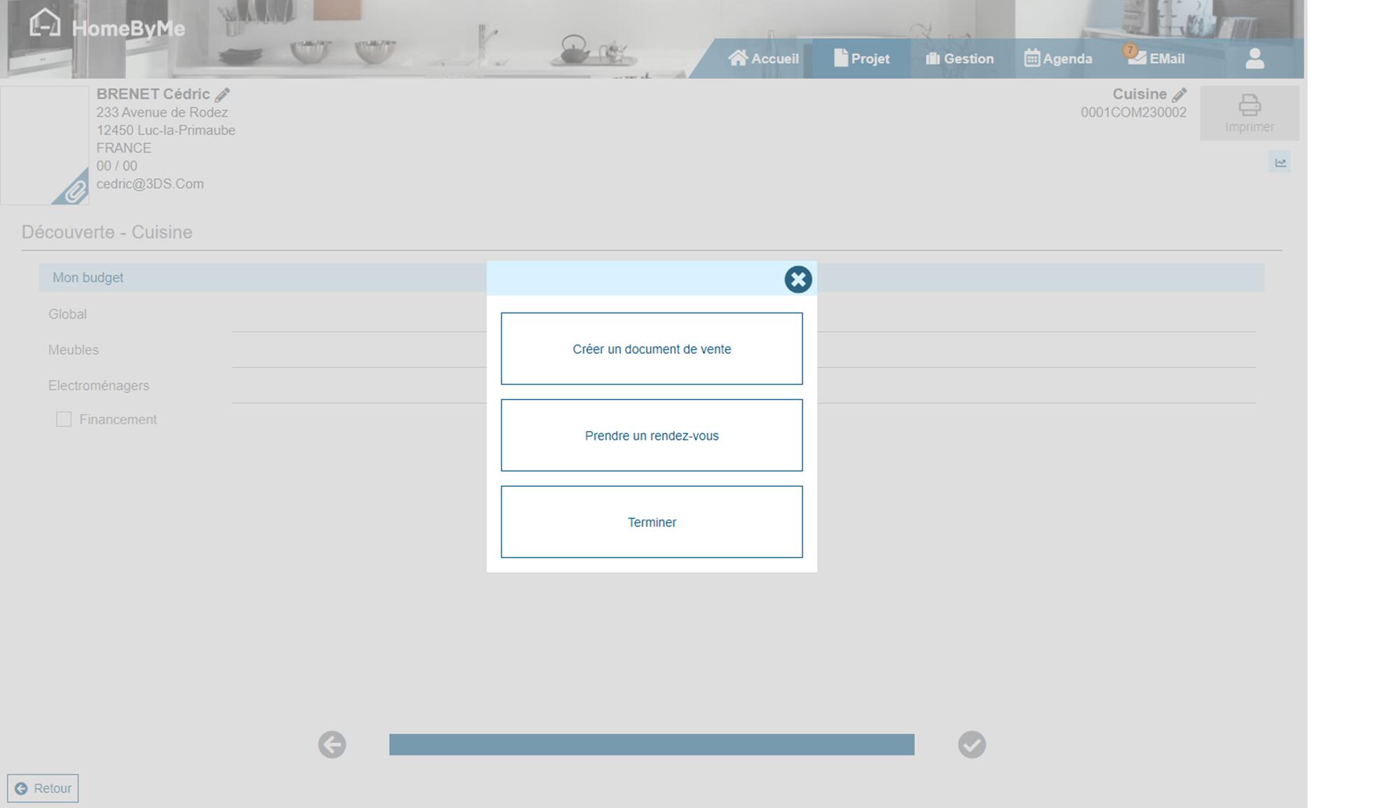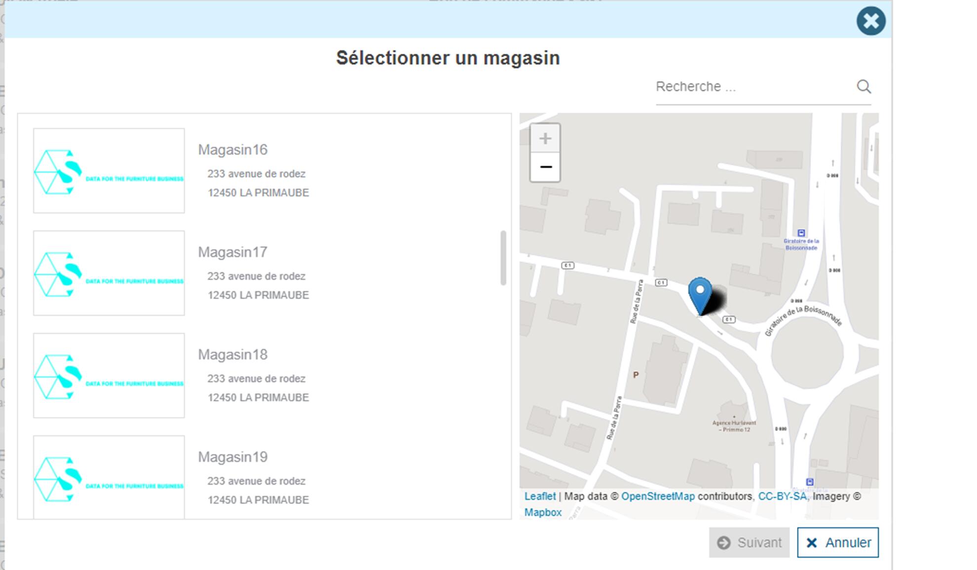 The first step in creating a project is to select the customer. Retail operations offers to choose the customer from the list of contacts known to the application. We find all the contacts of the stores to which the user is assigned. A search field allows us to find an existing customer. Once selected, we see an overview of the information known about this customer and the store to which he is attached. A setting is possible on request so that the list corresponds to the entire company and not only to the stores to which the user has access.