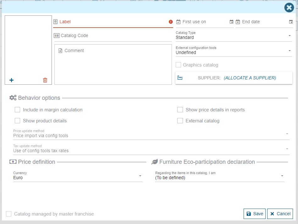 A catalog must have a name to be created. This is the only mandatory information. It is possible to add a description, a start date of use, an end date of use as well as the name of the supplier for this catalog (this is the supplier that will be used when generating purchases).