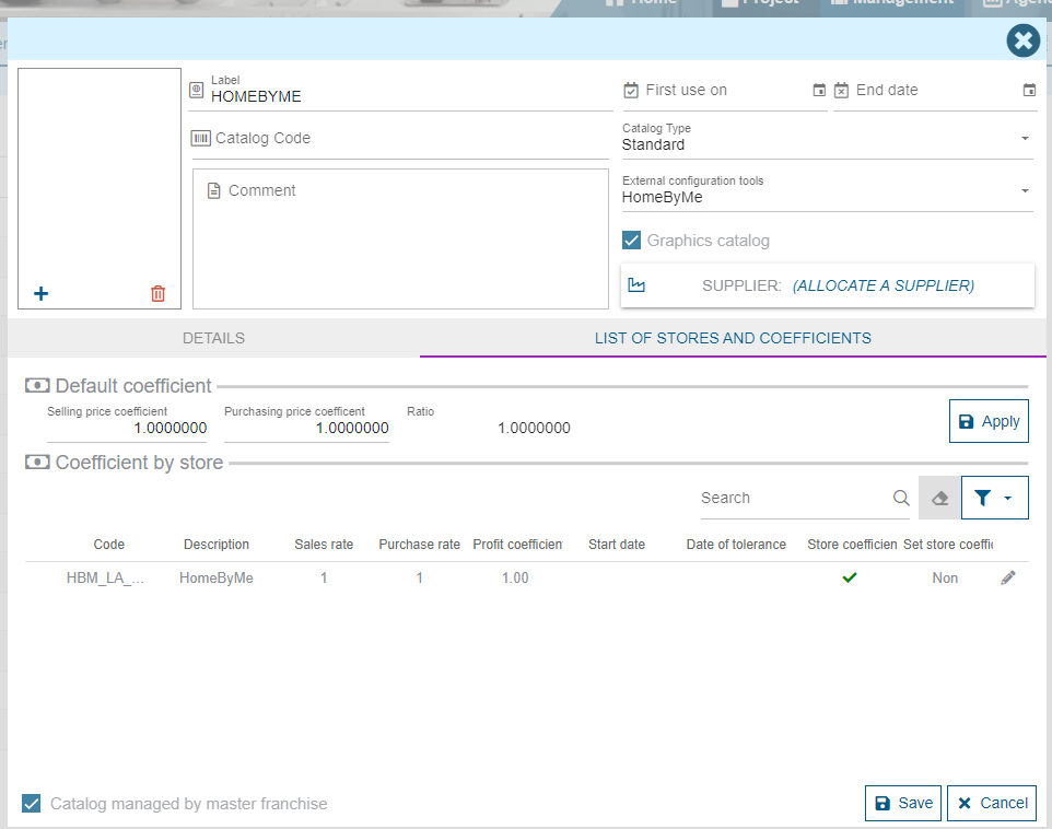 The "List of stores and coefficients" tab allows you to define whether the catalog is accessible to all stores or to some. It also allows you to enter personalized coefficients per store.
