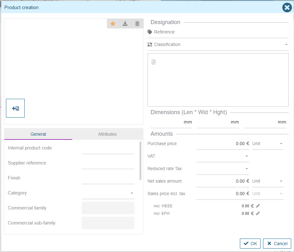 - Images: it is possible to assign several images to the product. A default image can be selected via the "star" icon provided for this purpose. The mandatory information to create a product is: its reference, its purchase and sale units as well as the applicable VAT rates.