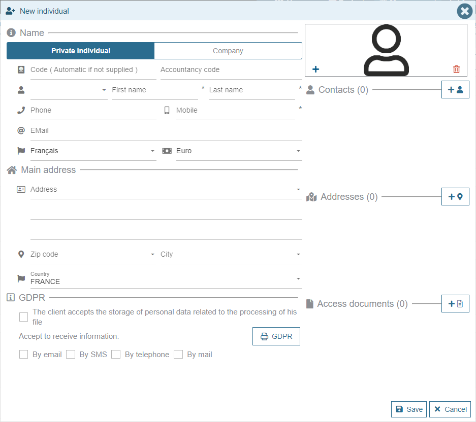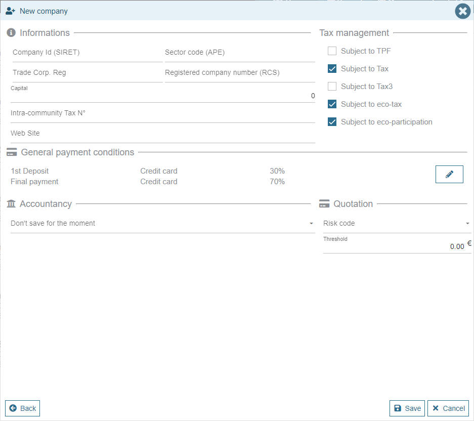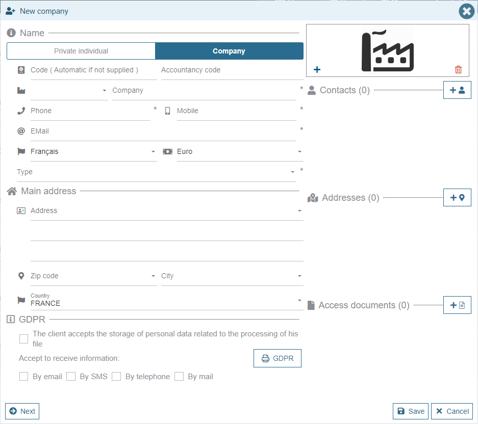 - Professional: In case you also sell to Professionals, you can choose the "Company" Customer type. A second data entry screen is added in order to enter additional information: VAT number, payment method, commercial conditions, etc.
