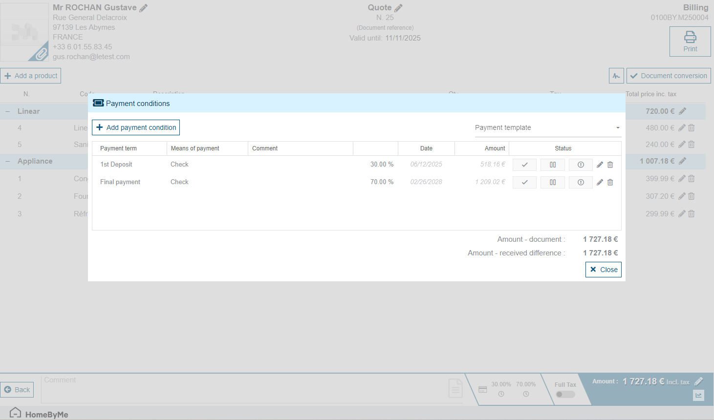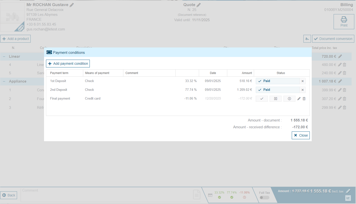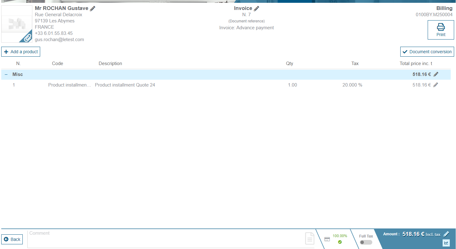 The invoice created contains the "Deposit" product with a pre-established description indicating: Deposit for order (quote) no. XXXX. The amount paid is taken into account as a deposit and the invoice is issued as a deposit invoice. Note that if the quote or order has several VAT rates, as many deposit lines will appear: one per VAT rate.