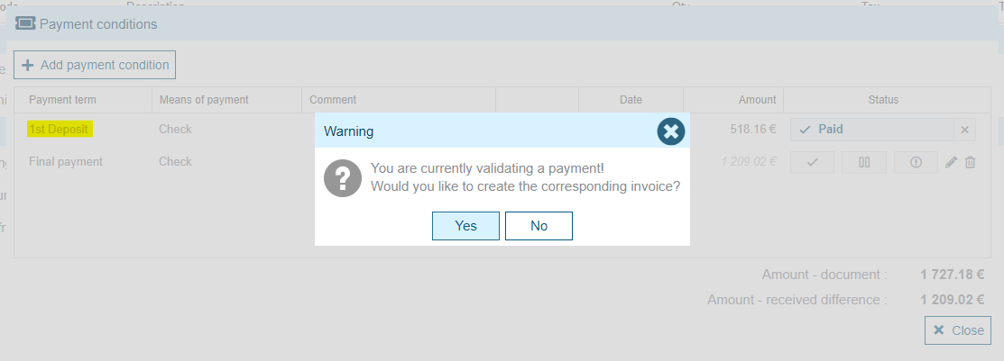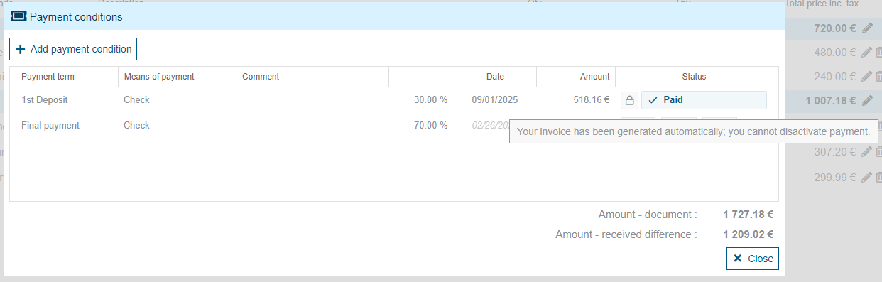 If, when modifying a sales document, you have recovered 100% of the deposit, a new due date will appear. With a negative or positive amount depending on your modifications (discount, VAT, etc.). If it is a positive due date (and not a deposit type due date), it will not affect the payment. You will need to create the balance invoice. If you want to be able to create a deposit invoice, you will need to change the due date type to make it a "deposit" type.