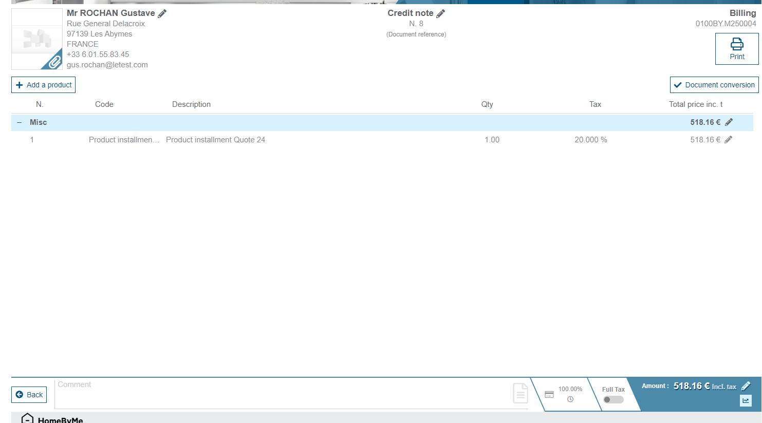 If there are one or more errors in your balance invoice, or for any other reason, to regenerate your balance invoice, you will need to issue a credit note on the balance invoice that is "false." Accounting-wise, the entries will be correct. When generating this credit note, we will "release" the document that generated this balance invoice. You will then need to return to the original document and redo the transformation into a balance invoice.