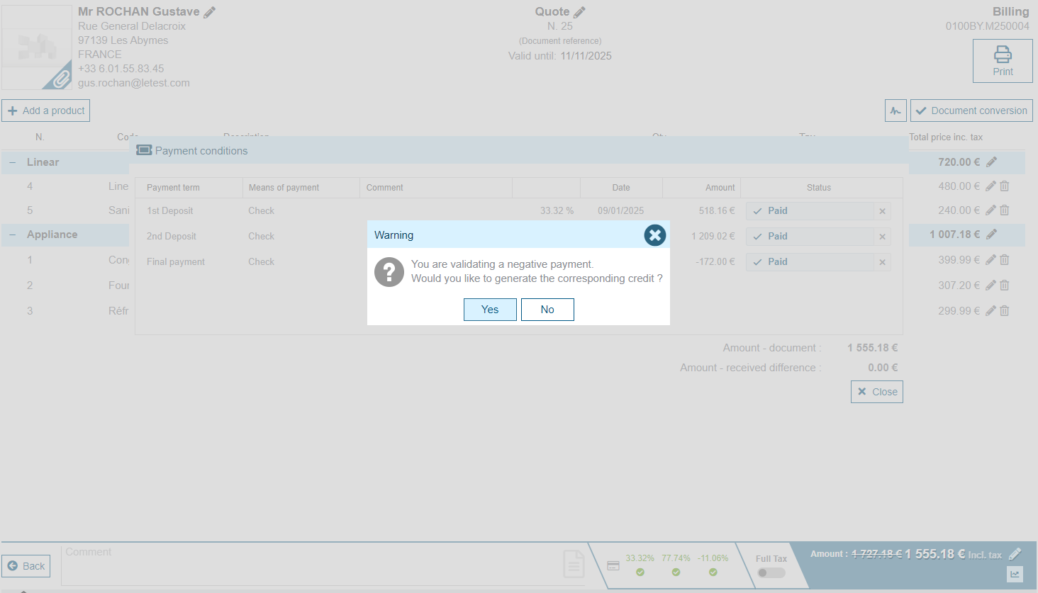 If the due date is negative during a payment, the system will ask you to generate a deposit credit note and not a deposit invoice. This will function in the same way as a deposit invoice (link between the due date and the credit note).