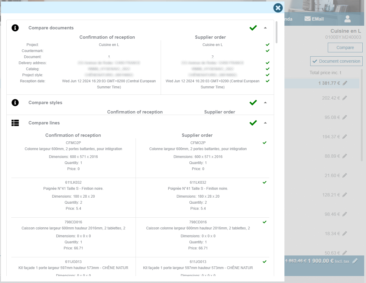 Open your Order acknowledgement, a new "Compare" button allows you to quickly display a new screen highlighting the differences between your initial purchase order and the imported Order acknowledgement: