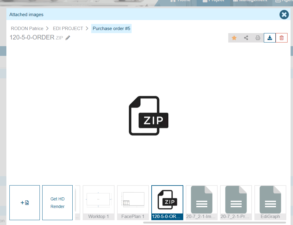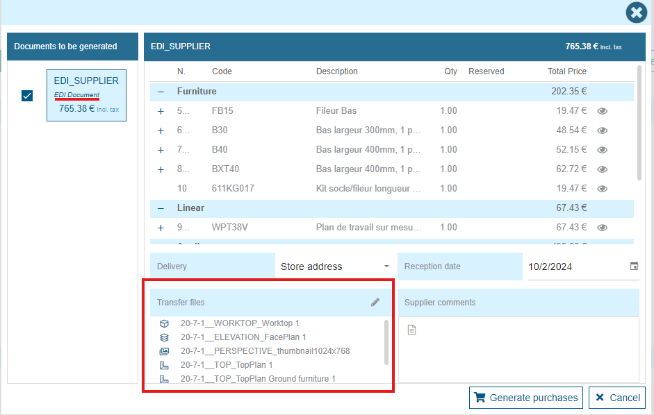 - an "ORDER.EDI" file, including all commercial data: your coordinates, your project information, the list of products to be ordered and their styling specifications