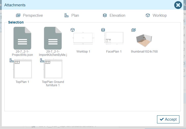 - a set of pictures, corresponding to the different technical views: plan (top view), worktops only, elevation views and perspective