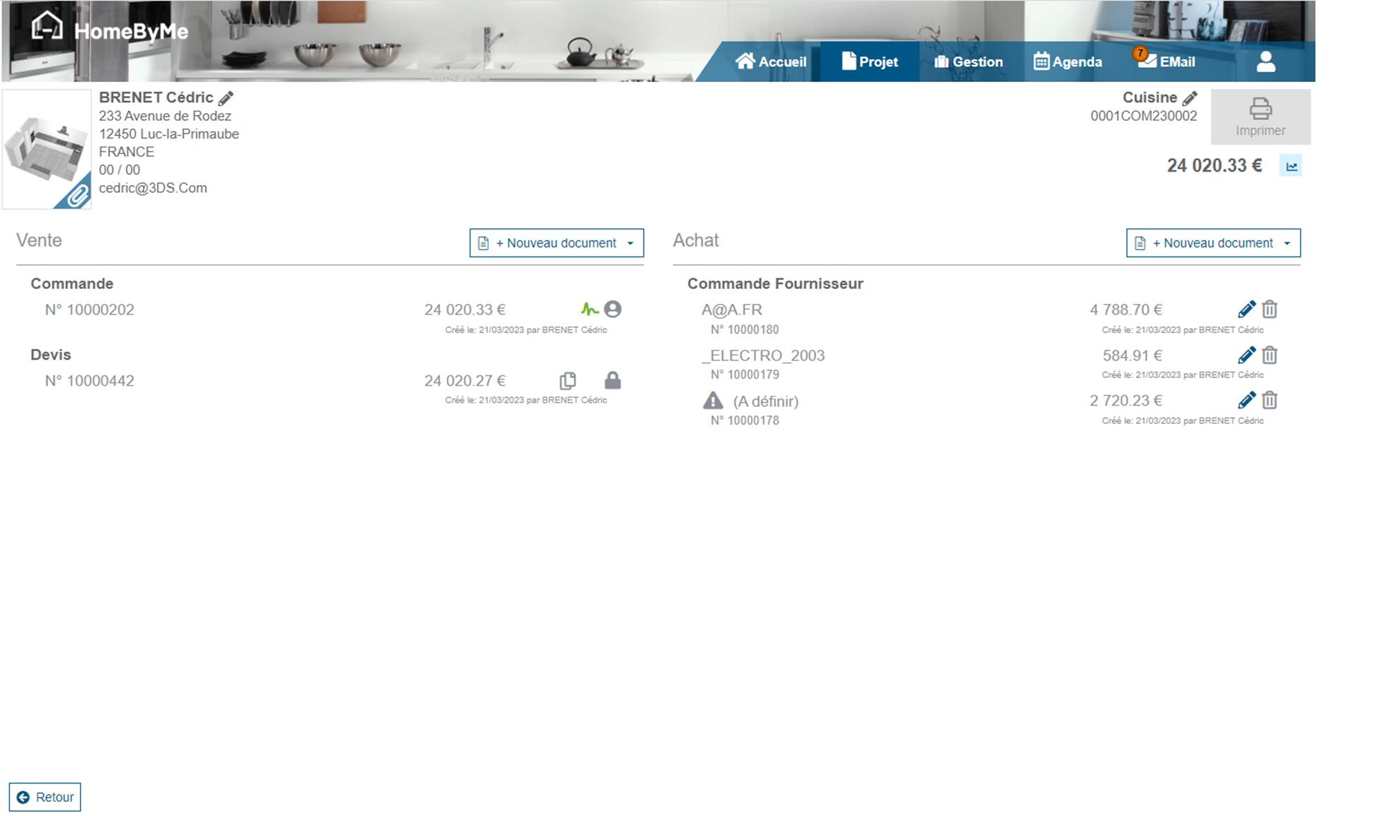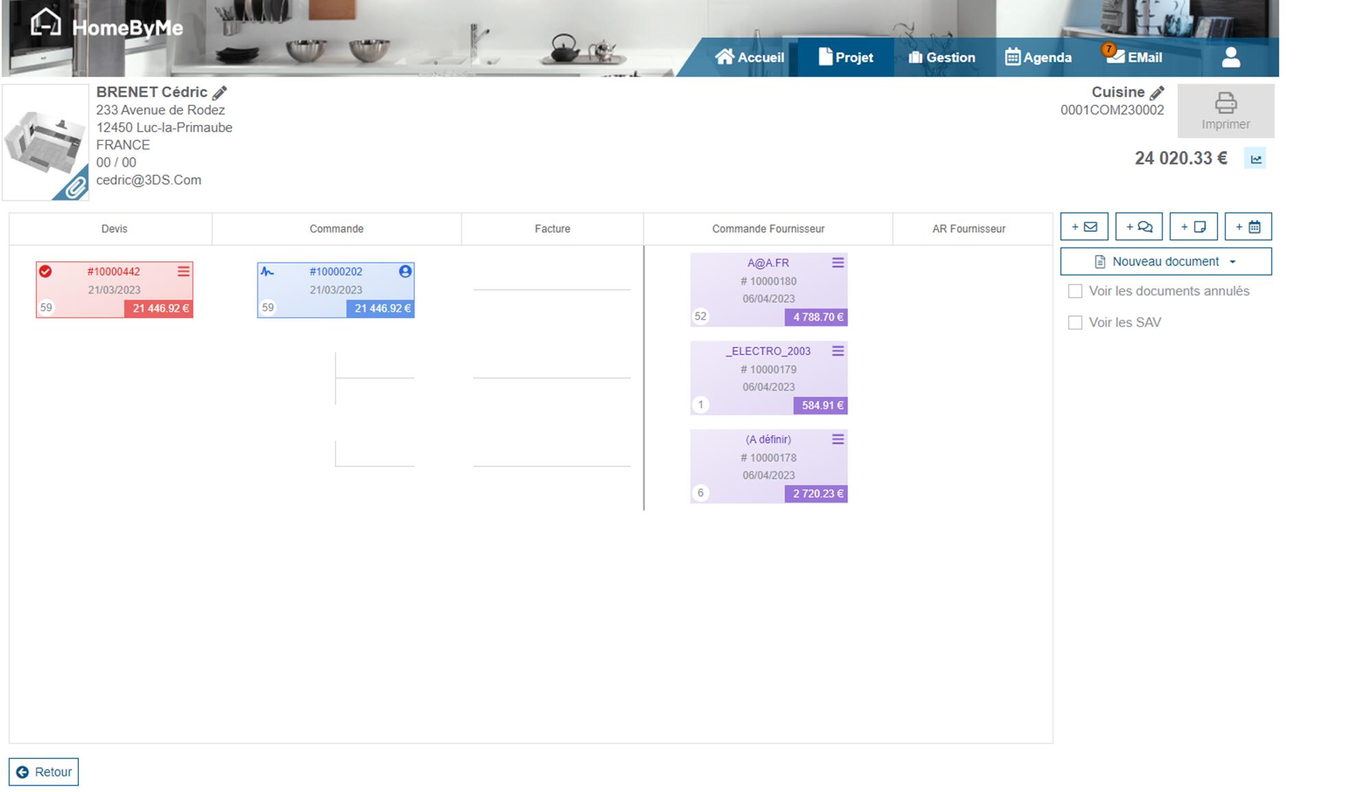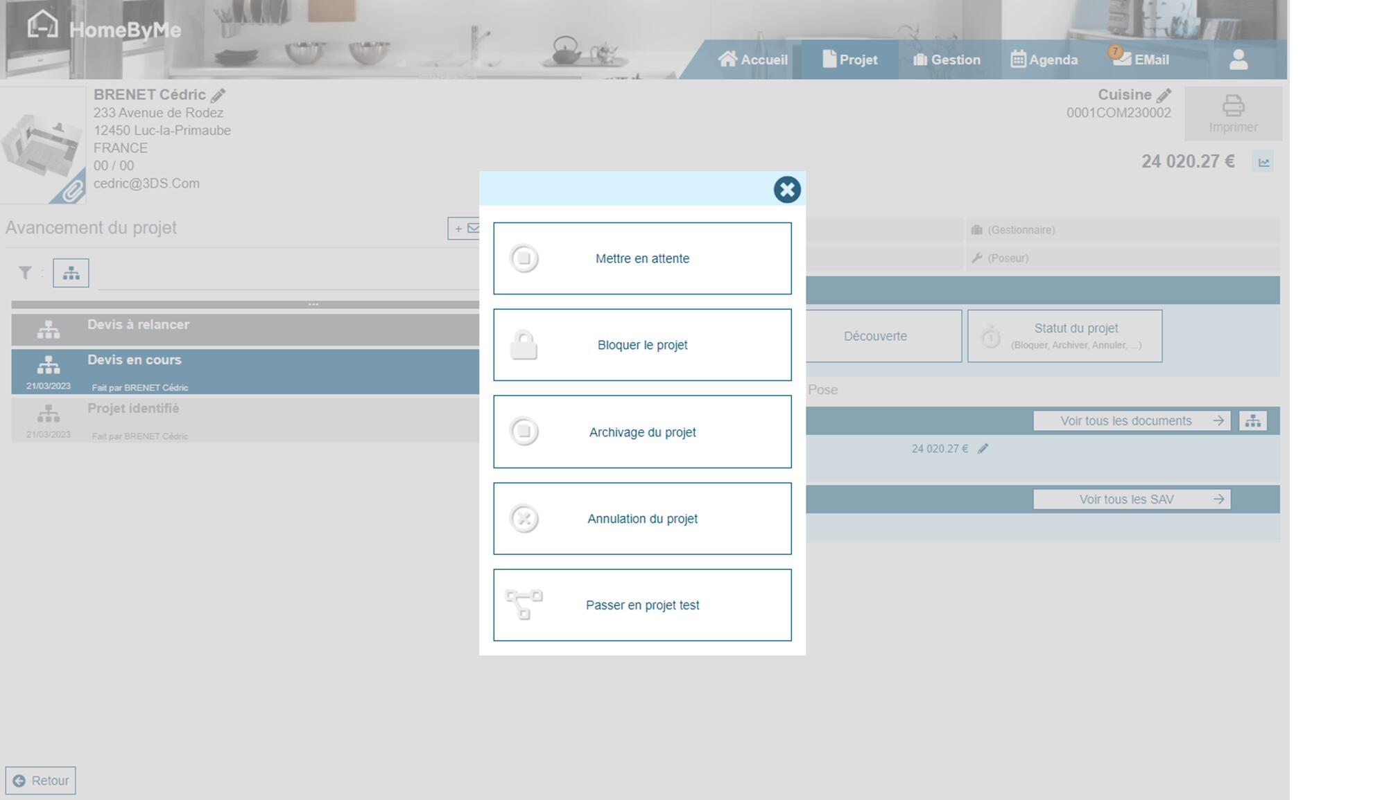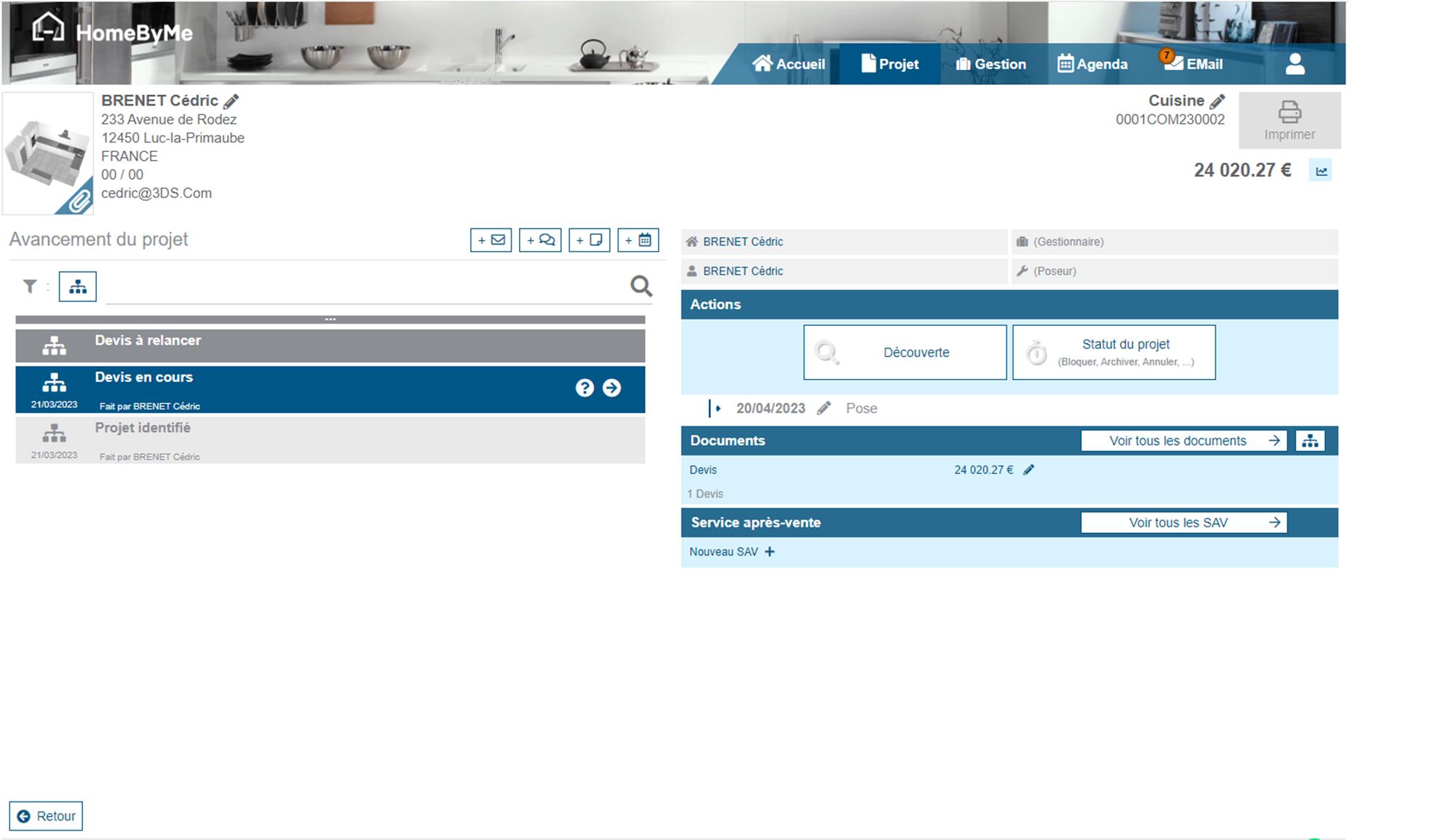 The Customer related with the current Project can be accessed on the top-left of the project detail page: name, address, phone numbers & email. You can edit this information if nedded.