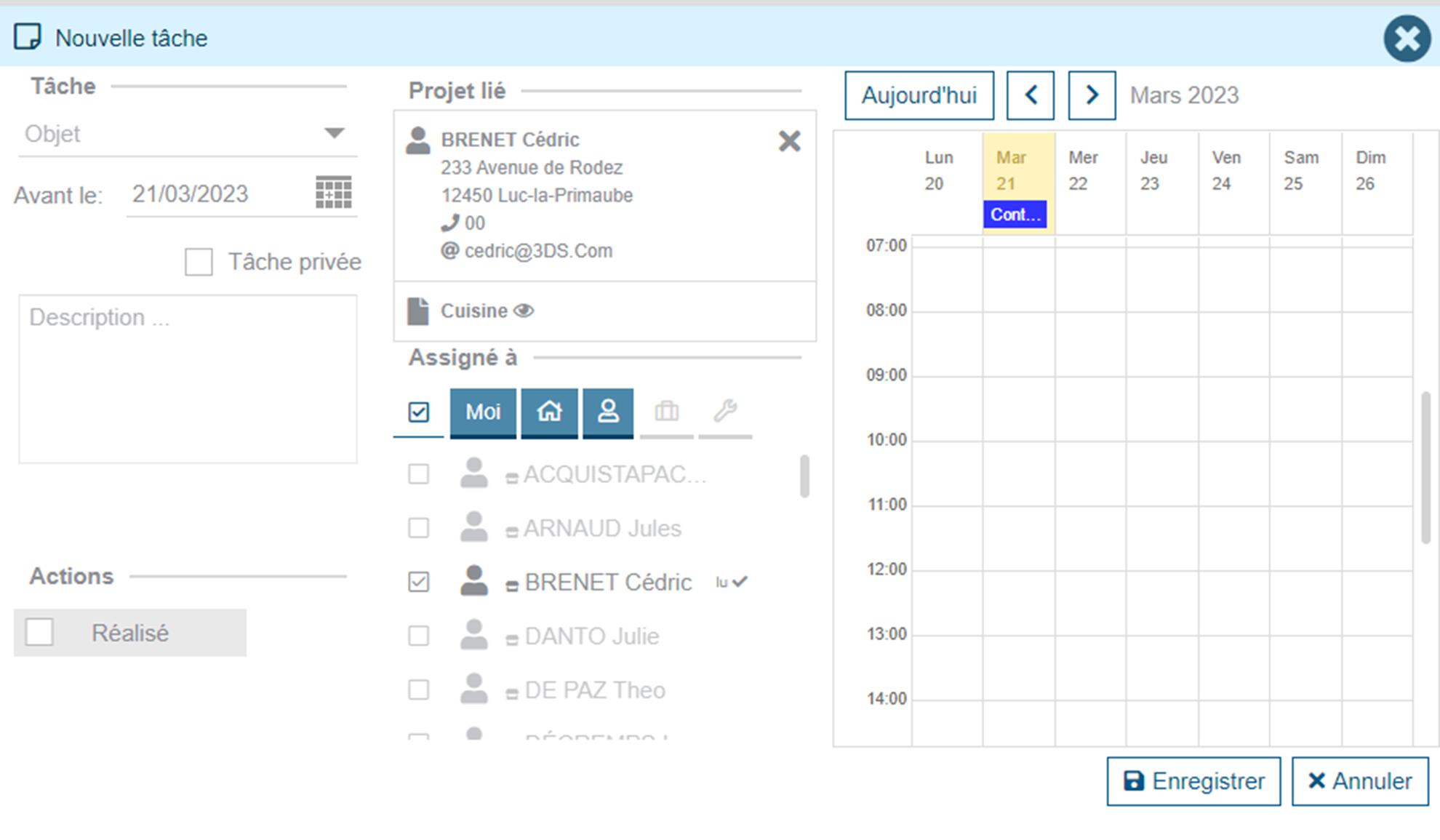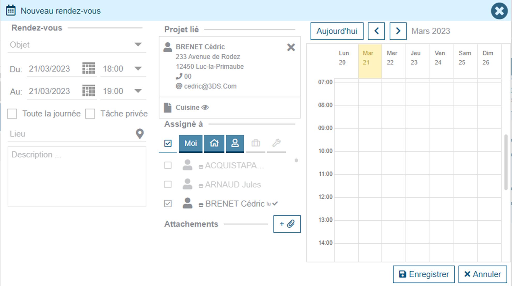 Appointments allow you to create an appointment in the selected user's calendar. You can select several for the same appointment. You define a start date and time and an end date and time. A location and notes can be added to an appointment. Created in a project, it is automatically linked to it. Created from another screen, it is not linked to a project but it is possible to assign it manually. An appointment can be indicated as