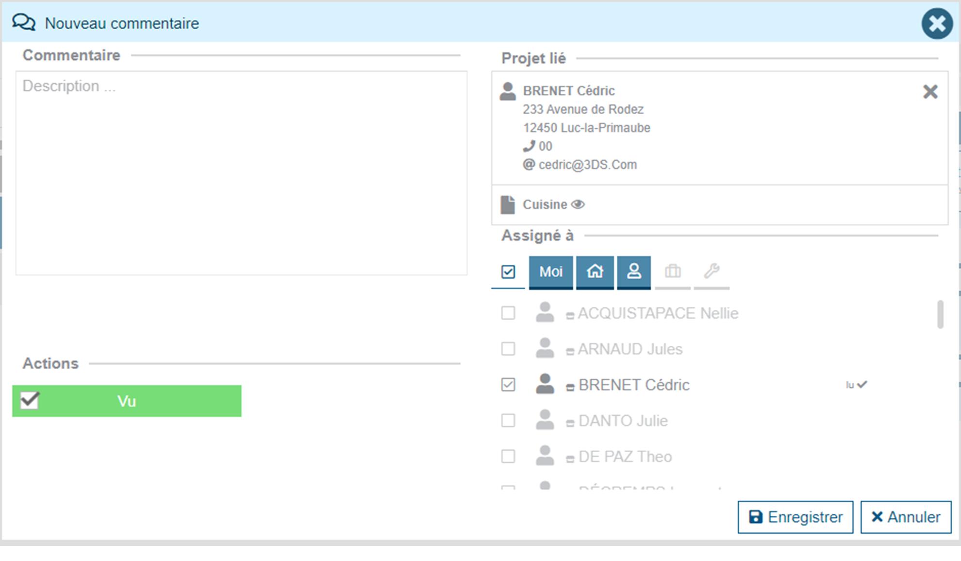 Comments are notes that a user can add in the application for themselves or for a colleague. A comment can be assigned to one or more people. As with other actions, it appears in the project to which it is linked as well as on the home page of the assigned person. A comment can be marked as "read" by users. The information will be visible to everyone in the comment.