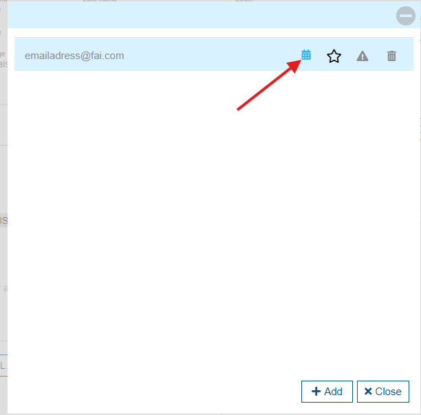 After adding this email address, you will be able to synchronize with the Retail Ops calendar. You will need to click on the calendar icon next to the email address. This will launch the synchronization between your calendar provider (ex: Outlook) and our agenda. This will create a calendar at your provider by taking the email address of your account (password forgotten) and adding -smo at the end (example: email-password-forgot@fai.com-smo). It will be necessary to pay attention to properly use this calendar so that the synchronization works in both directions.