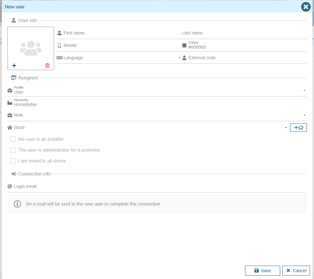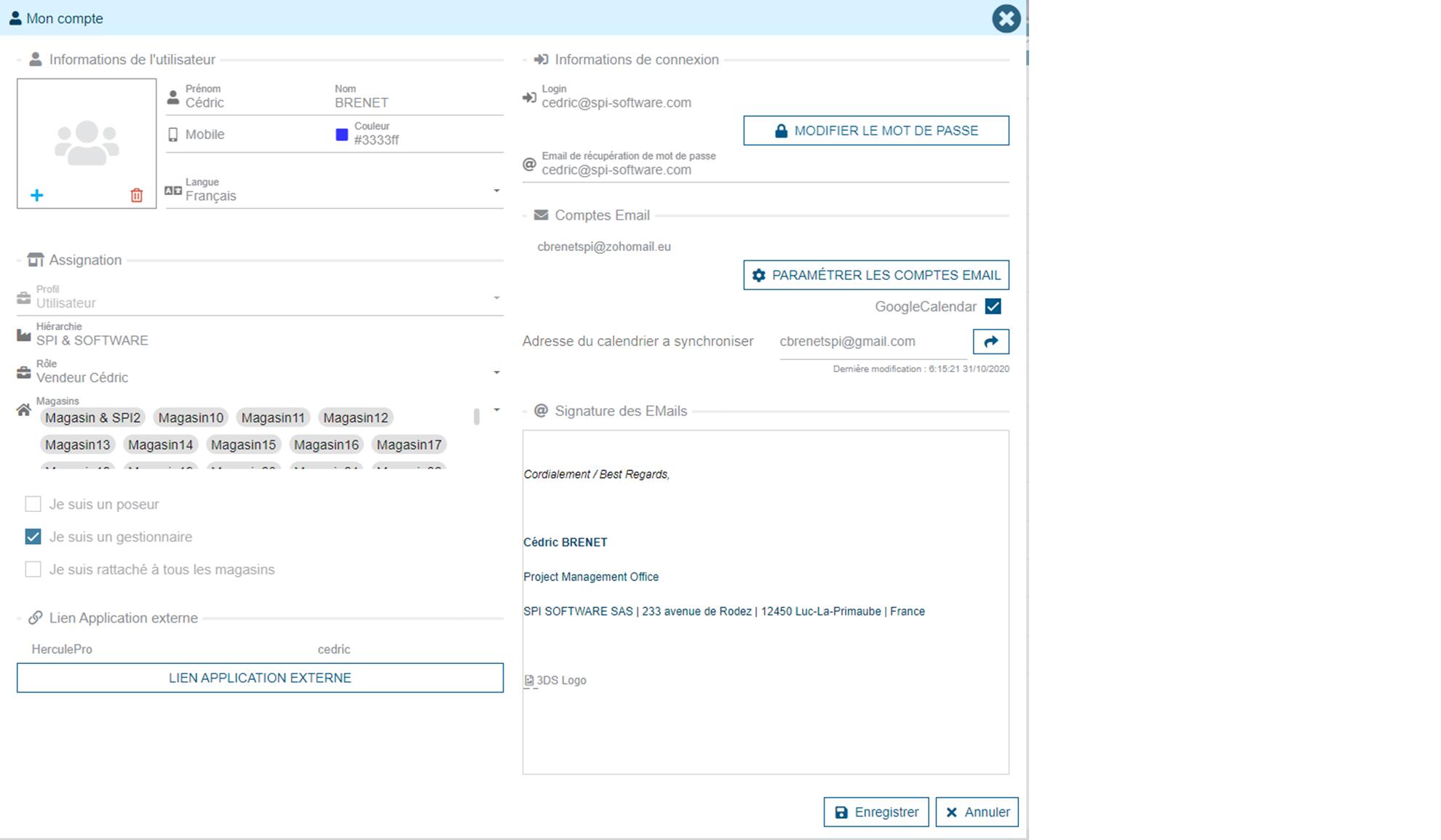 Users can change their contact information: name, first name, phone number. They can also change the color used for calendars and add an image for their user. This image will be visible to other users, particularly in comments exchanged between people. Les champs suivants seront toujours modifiables : image, nom, prénom, mobile, couleur, langue, rôle, liste des magasins, mot de passe, email de récupération de mot de passe, les adresses mails liées au compte et la signature de mail.