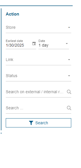 - Search on external / internal reference: search on the "Internal reference" and "External reference" columns (attention exact search)
