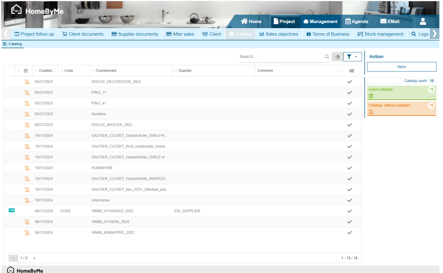 In the "Management" menu, you can access the list of catalogs. There are two main families of catalogs: