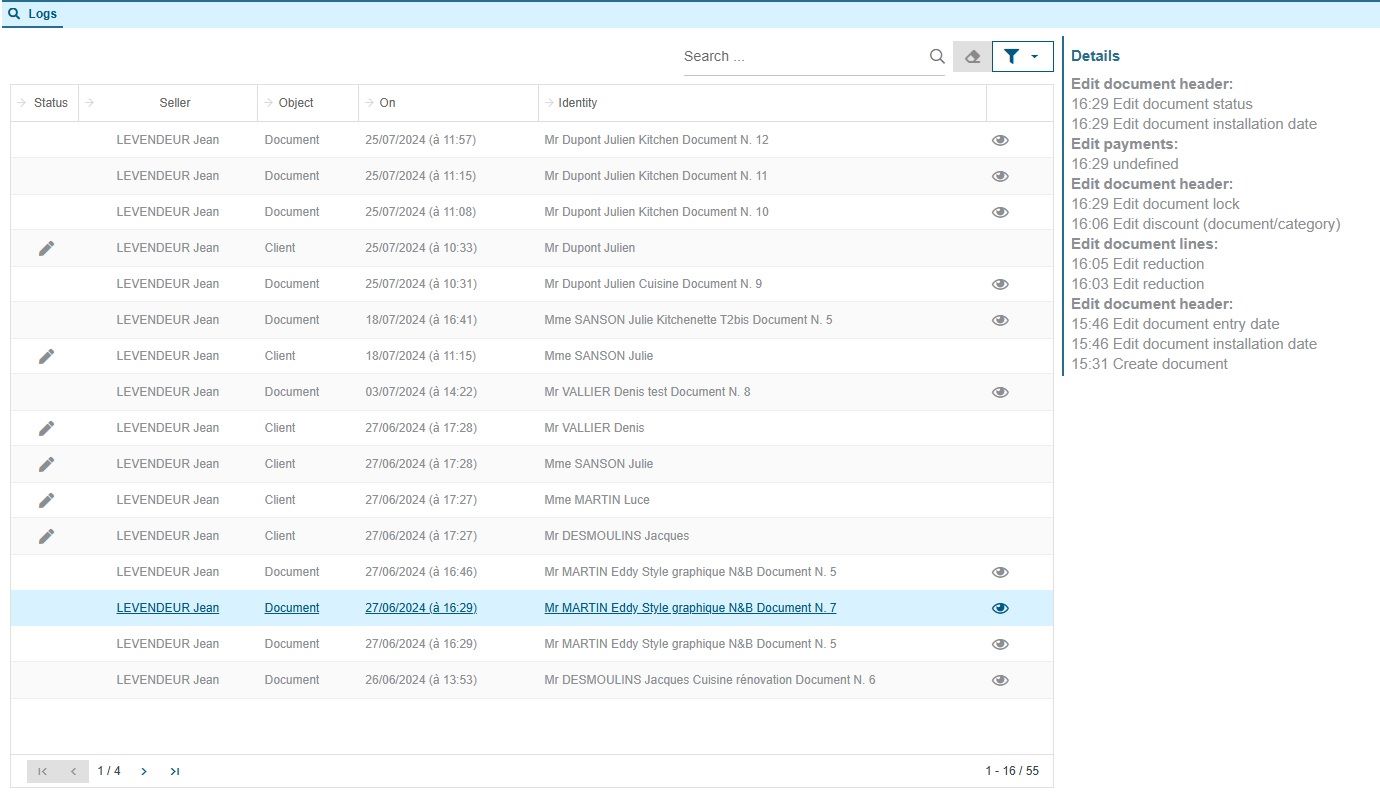 Some concepts of the application are particularly monitored (Client, Project, Document, ...), due to their importance. Thus, the sensitive actions carried out by users on these concepts are transcribed by the system in logs that can be consulted via the Management menu. These modifications are grouped by entity and action date. As is often the case, a filter and search menu allows you to find the modifications made to a particular concept.