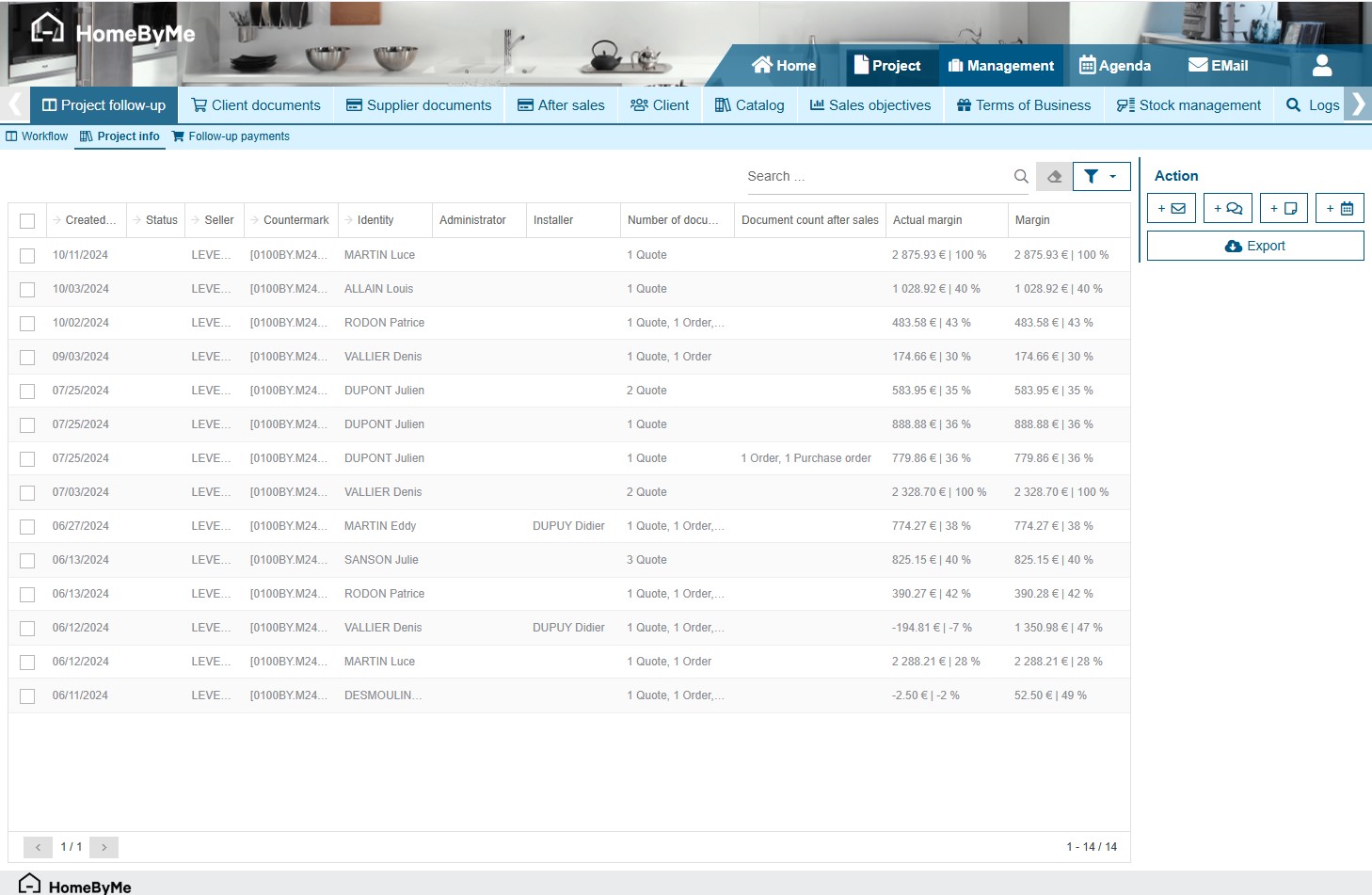 This screen is another way of displaying projects. It allows you to view the types of documents present in the project, and to check actual and theoretical margins by project. It can be filtered by store, salesperson, workflow or project type.