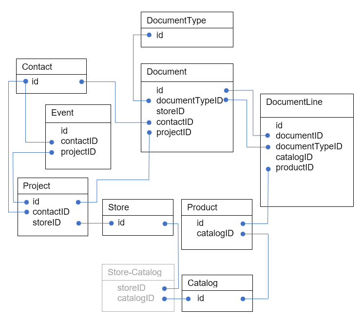 A Store owns 0..N projects, 0..N catalogs, 0..N documents