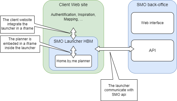 In order to launch the Home.by.me application, the calling web site must use the HomeByMe Launcher, which will itself dialogue with the home.by.me application, acting as an intermediary between the two systems.