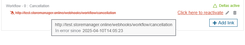 When an uninterrupted succession of failed calls has occurred over a period of at least 12 hours for the same duo [URL - API Key], the Webhooks system will decide to isolate them and stop trying to contact them, in order to avoid overloading the Logs with untimely failures. The corresponding subscription will then be displayed in red with a strikethrough in the list, in order to alert you about its status: