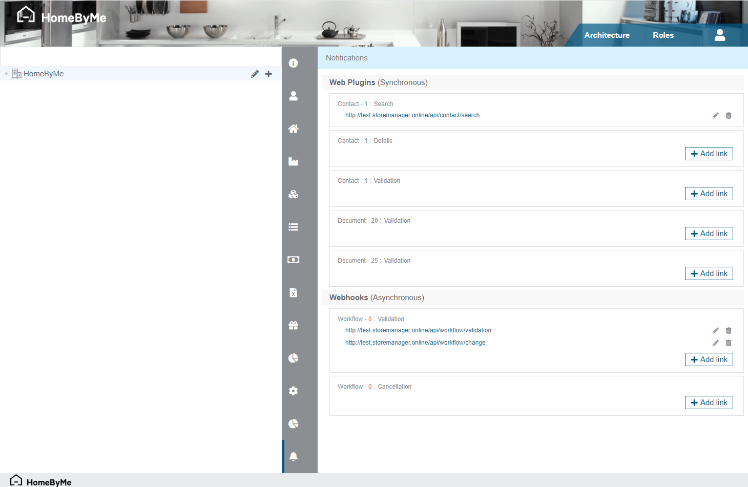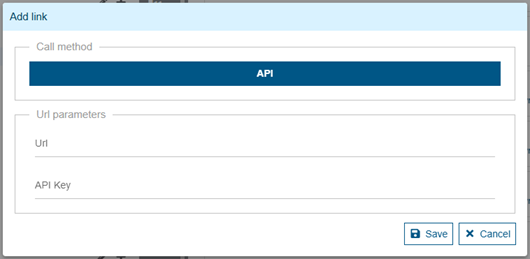 For each notification (cf. Entities concerned), clicking on the "+ Add link" button opens a screen that will ask you for the URL that will be called, and an optional API Key that will be passed to each request.